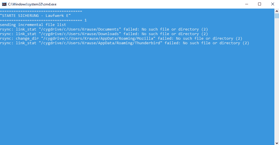 - Fügen Sie keine leeren Zeilen in den rsync-Block ein. Es handelt sich um eine lange Befehlszeile, die auf mehrere Zeilen aufgeteilt ist. Ein Leerzeichen beendet die Befehlszeile und interpretiert die letzte Zeile als Laufwerksziel. Sie löschen hiermit einen der Ordner, den Sie eigentlich sichern wollen.